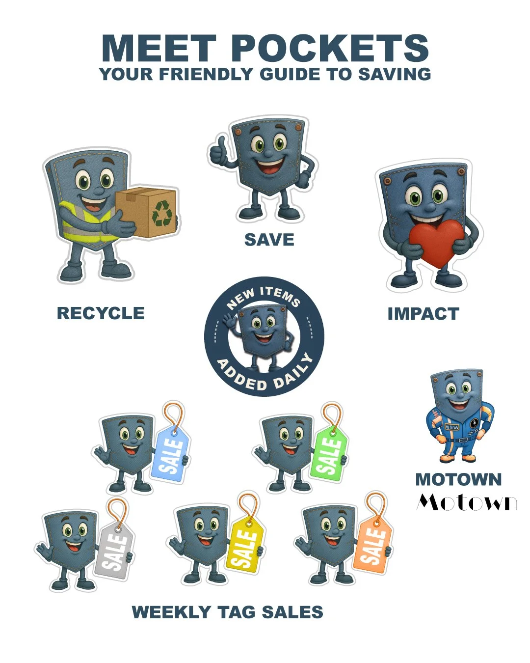 Our friendly little denim pocket represents everything thrift shopping is about — discovering hidden treasures, saving money, and giving great items a second life while keeping a little extra in your pocket.